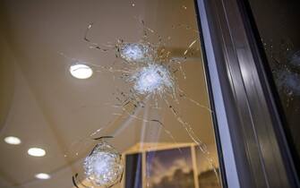 Nella foto, i segni dei proiettili sparati dall’attentatore con un kalashnikov poco prima delle 21 della sera del 20 aprile -