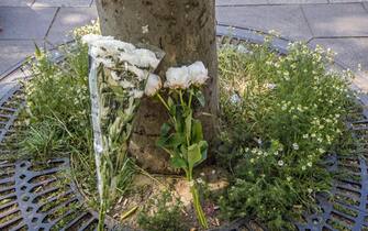Nella foto, un’immagine del cordoglio cittadino sul luogo della sparatoria dove, da questa mattina, si depositano fiori -