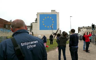 L'artista di strada britannico ha eseguito una delle sue famose opere nei pressi di un luogo emblema della fuoriuscita della Gran Bretagna dall'Europa: il porto che unisce l'isola al resto del continente. LA FOTOGALLERY