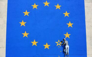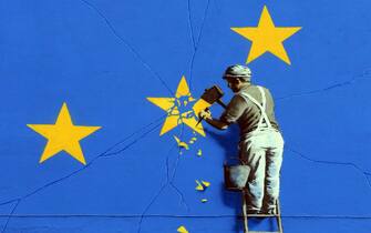 Un operaio su una scala che rimuove a martellate una delle stelle della bandiera europea. È la Brexit secondo Banksy, il misterioso writer cresciuto a Bristol e famoso in tutto il mondo, che la mattina dell'8 maggio ha fatto trovare questa nuova opera su un muro vicino al porto di Dover, in Inghilterra –
