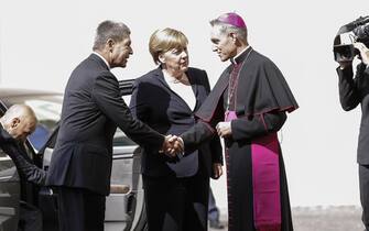L'arrivo di Angela Merkel con il marito, accolti dall'arcivescovo Georg Ganswein