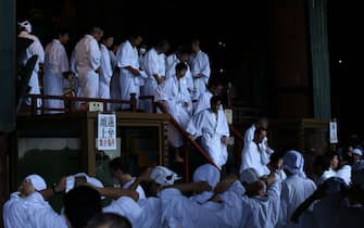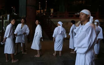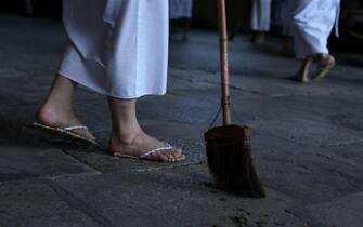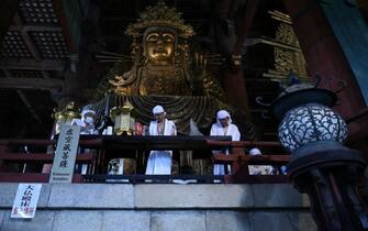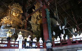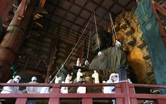 I monaci buddisti sono all'opera al Todai-ji (che in giapponese significa "Grande tempio orientale") per i lavori di spolveratura che, ogni anno, interessano la statua del Grande Buddha -
