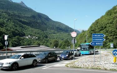 Lunghe code di auto al confine italo-svizzero per la strada chiusa a causa della frana (Fotogramma)