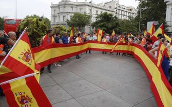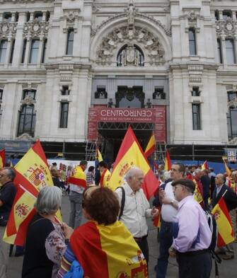 A Madrid, gli attivisti della Fundación Denaes, che lotta per la “difesa della nazione spagnola”, hanno organizzato in piazza Cibeles una manifestazione contro il referendum catalano -