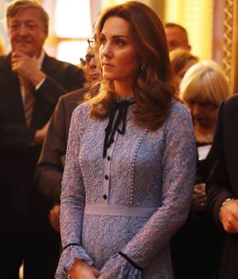 La duchessa di Cambridge ha partecipato a un evento organizzato in occasione della Giornata mondiale della salute mentale. L'abito di pizzo celeste indossato da Kate ha lasciato intravedere i primi segni della gravidanza -