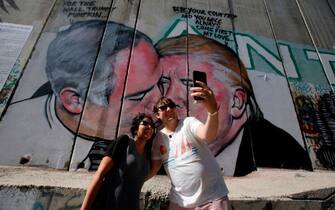 Le facce di Donald Trump e Benjamin Netanyahu campeggiano su un tratto della barriera di sicurezza tra Israele e Cisgiordania, vicino a Betlemme. A riportare la notizia per primi sono stati i media israeliani, e le foto del capo della Casa Bianca che bacia il primo ministro d'Israele stanno facendo il giro del mondo -
