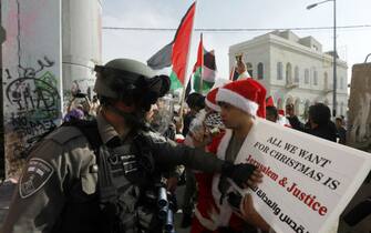 Un soldato israeliano a tu per tu con un manifestante palestinese travestito da Santa Claus a Betlemme, durante una singolare protesta "natalizia" -