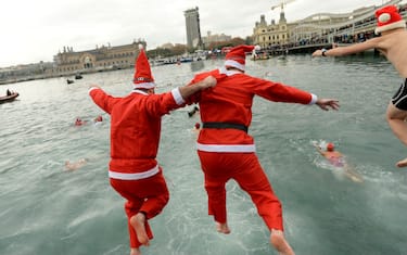 Partecipanti travestiti da Babbo Natale si tuffano nelle acque del Port Vell, il porto vecchio di Barcellona. La "Copa Nadal", giunta all'edizione numero 108, è uno degli eventi tradizionali del giorno di Natale, così come il bagno dei membri del "The King Edward's Bay swimmers" a Newcastle -