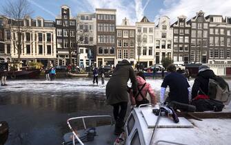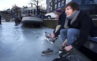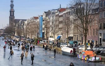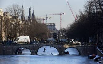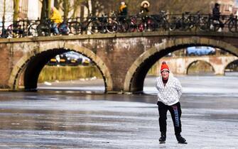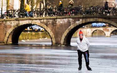 L'ondata di freddo che sta attraversando l'Europa ha gelato anche i canali di Amsterdam. Residenti e turisti ne hanno approfittato per pattinare. Nella foto, un uomo sfreccia lungo il Keizersgracht -