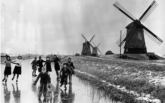 Pattinare lungo i canali è una tradizione antica, come dimostra anche questa foto, che ritrae un gruppo di ragazzi a Volendam (non lontano da Amsterdam) nel 1946 -
