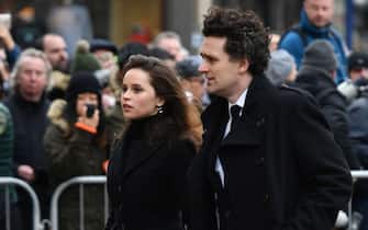Il prossimo 15 giugno le ceneri dell’astrofisico saranno tumulate nell'abbazia di Westminster, accanto alla tomba di Isaac Newton. Nella foto Felicity Jones insieme al compagno Charles Guard prima di entrare in chiesa –