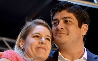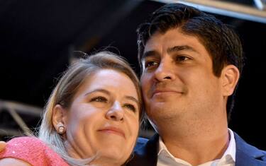 Alvarado Quesada, 38enne ex ministro del Lavoro, sarà il più giovane presidente della storia recente del Paese. In gioventù ha fatto anche parte di una rock band. Nella foto, con la moglie Claudia Dobles -