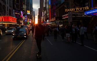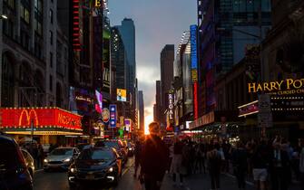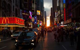 Tramonto spettacolare a New York dove, a cavallo del solstizio d'estate, il sole si allinea con il piano stradale di Manatthan. Il fenomeno, soprannominato Manhattanhenge, si verifica due volte all'anno e di solito cade in date vicine al 28 maggio e al 12 luglio -