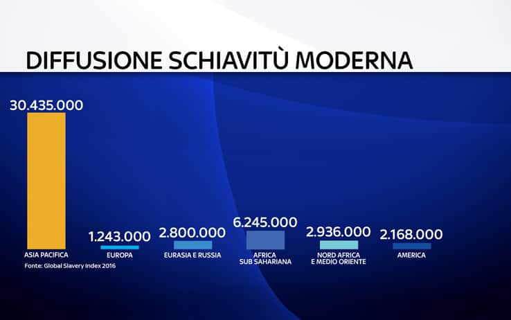 Lavorano in cambio di niente; vengono sfruttati sessualmente, come forza lavoro, come manodopera per la criminalità o per i loro organi. Il 10% degli schiavi è un "migrante". Una nuova schiavitù, presente in Asia, negli Stati Uniti e anche in Europa