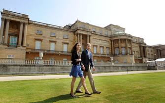 Con il matrimonio, Kate Middleton assume il titolo di “Sua Altezza Reale la Duchessa di Cambridge". Nella foto, William e Kate camminano mano nella mano a Buckingham Palace il giorno dopo il loro matrimonio. Ad aspettarli c'è un elicottero che li porterà in una location segreta per la luna di miele. È il 30 aprile 2011 -