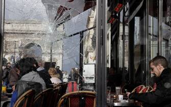 Nella foto, alcune persone siedono in una terrazza sugli Champs Elysees poco distanti da un vetro danneggiato durante le proteste del 16 marzo -