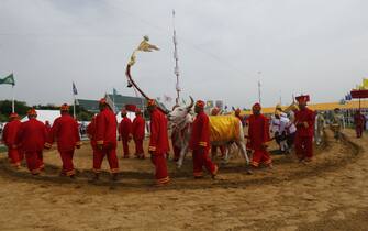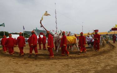 Durante la cerimonia, il cosiddetto "Signore del raccolto" inizia l’aratura del terreno con l’aiuto dei tori sacri