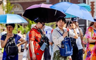 Anche i turisti presenti ad Amsterdam cercano di ripararsi dal sole e dalle temperature che arrivano a sfiorare i 40 gradi