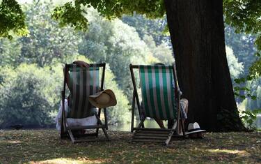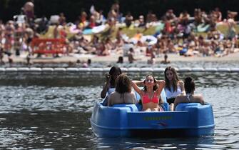 Nel Regno Unito, la punta massima di caldo è stata certificata a Cambridge a quota 38,1 gradi. Nella foto: turisti e cittadini cercano riparo dal caldo ad Hyde Park, a Londra, dove il termometro ha segnato 37 gradi