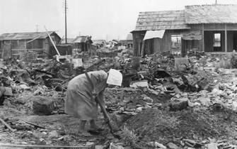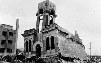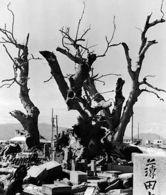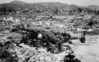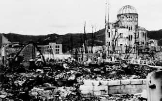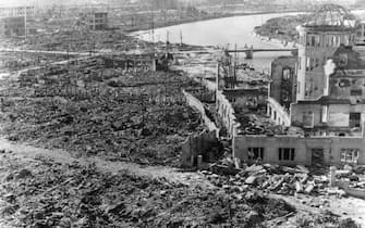 Nell'immagine uno scorcio di Hiroshima devastata dopo il lancio della bomba atomica. Tre giorni dopo un secondo ordigno fu sganciato su Nagasaki, uccidendo altre 74.000 persone