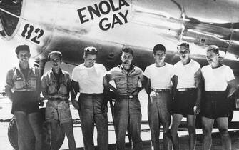 Una squadra dell'aeronautica americana in posa davanti al bombardiere B-29 ''Enola Gay'' dal quale fu sganciata la bomba atomica sulla città giapponese di Hiroshima nell'agosto 1945