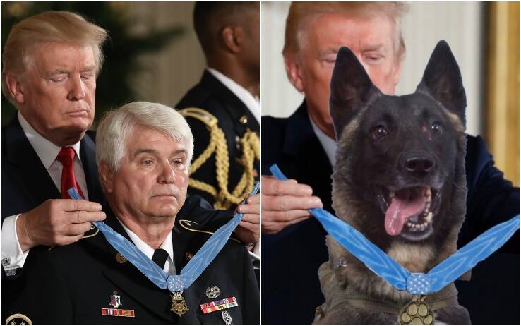 Come ha scritto il giornale americano, la foto sarebbe una versione modificata di una vera fotografia di Trump che assegna la medaglia d'onore nel 2017 a James McCloughan, un medico dell'esercito in pensione che ha ricevuto l’onorificenza per aver salvato la vita di alcuni suoi commilitoni nella guerra in Vietnam, in una battaglia del 1969. Nell'immagine in questione, però, al posto del volto del militare 75enne, compare il muso del cane. Sul caso, è intervenuto anche lo stesso McCloughan che, intervistato dal New York Times, si è limitato a commentare: “I cani militari sono molto coraggiosi”.