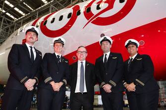 La compagnia aerea fu fondata come Queensland e Northern Territory Aerial Services Ltd (da cui l'acronimo Qantas) il 16 novembre 1920. Nella foto il Ceo di Qantas Group Alan Joyce con alcuni membri dell'equipaggio della compagnia