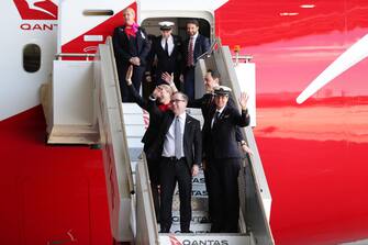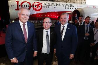 Il mese scorso Qantas aveva già completato un altro volo record non stop da New York a Sydney. Nella foto il Primo ministro australiano Scott Morrison, il Ceo Qantas Alan Joyce e il leader Labor Anthony Albanese
