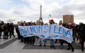 A Parigi centinaia di persone si sono ritrovate davanti alla Tour Eiffel con gli ormai famosi cartelli a forma di pesce e intonando canzoni come "Bella Ciao"