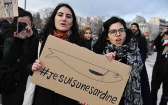 "Je suis une sardine" (tradotto: io sono una sardina), è uno degli slogan che compare sui cartelli a Parigi