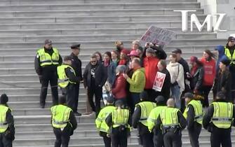 In questo frame, tratto da un video pubblicato da TMZ, si vede il momento in cui Joaquin Phoenix viene portato via dalle forze dell'ordine dalla scalinata di Capitol Hill