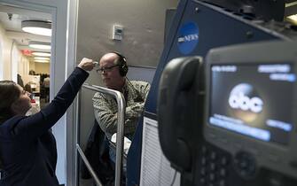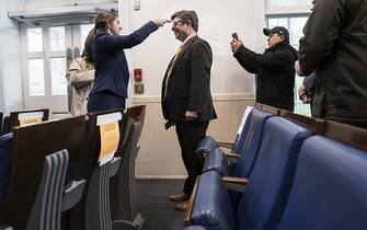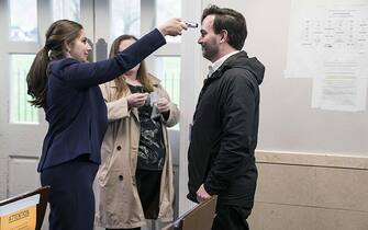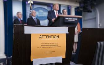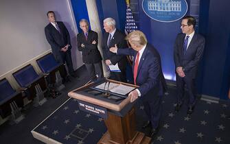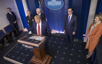 "Abbiamo bisogno di far circolare questo denaro attraverso l'economia americana e inviarlo ai lavoratori americani", ha dichiarato il segretario al Tesoro Steven Mnuchin. Nella foto, controllo della temperatura prima della conferenza di Trump