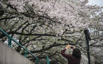 Il codice verde in aree ad alto rischio, invece, obbliga a seguire specifiche regole di viaggio delle autorità locali. (Nella foto una donna fotografa i ciliegi in fiore a Wuhan)
