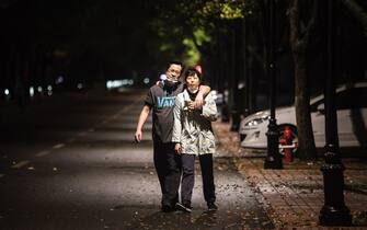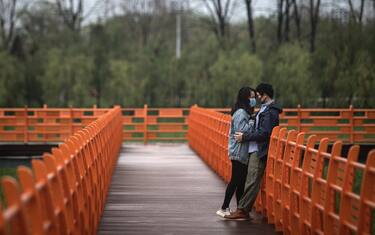 Il giallo certifica un contatto ravvicinato con infetto e il divieto agli spostamenti. (Nella foto una coppia passeggia nel parco Jiangtan di Wuhan)