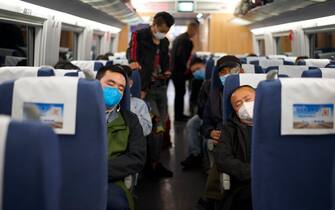 Il primo autobus, il 25 marzo, è partito alle 5:25 dal terminal della Hankou Railway Station, sbloccando il trasporto pubblico di Wuhan fermo da 9 settimane. (Nella foto passeggeri su un treno alla stazione di Macheng)