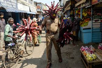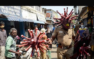Alcuni agenti della polizia di Chennai e di Bangalore pattugliano le strade armati di manganello, indossando caschi da moto in stile Covid-19