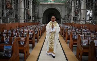 A Angels City, nelle Filippine, il sacerdote celebra la messa in una chiesa vuota, sui cui banchi ci sono le foto dei fedeli
