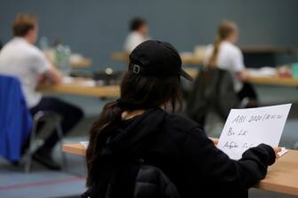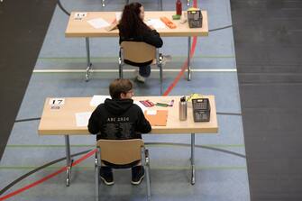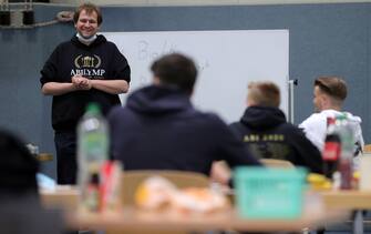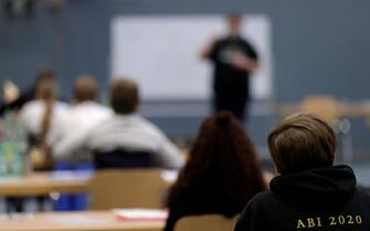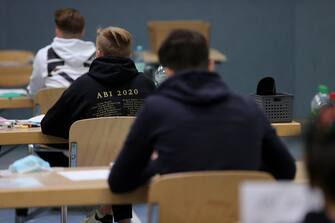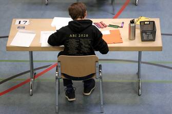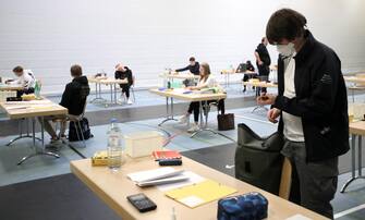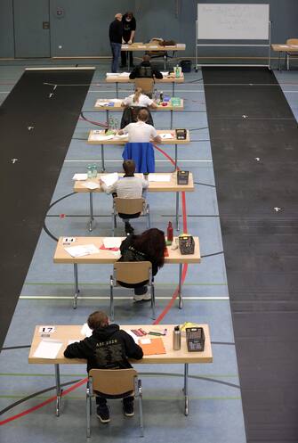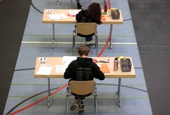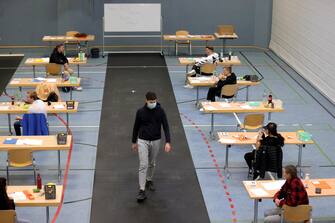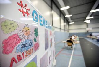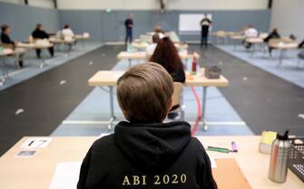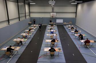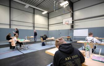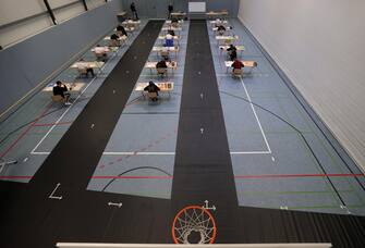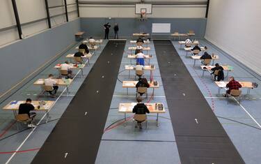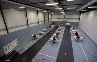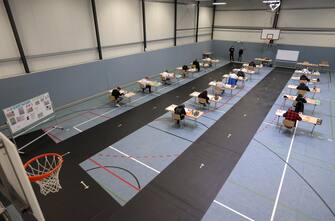 In Germania sono iniziati gli esami di scuola secondaria superiore. Palestre e altri spazi ampi sono stati convertiti in classi dove è possibile mantenere il distanziamento fisico. Nella foto, una scuola di Dortmund