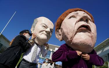 I manifestanti hanno realizzato le maschere del ministro delle Finanze tedesco, Olaf Scholz, e della cancelliera, Angela Merkel