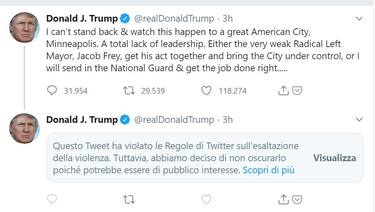 Dopo l'azione di Facebook, Twitter ha deciso di censurare ancora una volta Donald Trump. Sotto ad uno dei suoi tweet è comparsa la scritta "Manipulated media": il tycoon aveva postato una versione 'taroccata' di un video molto popolare sui social, virale già dal 2019. Nel filmato si vedono due bimbi, uno bianco e uno afroamericano, che corrono l'uno verso l'altro, con abbraccio finale. Nel video postato da Trump si vede invece il bimbo bianco inseguire quello nero con in sovrimpressione la scritta: "Bambino terrorizzato fugge da bambino razzista".