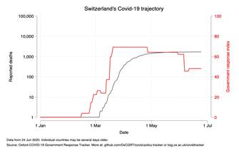 Da gennaio 2020 il Governo svizzero non ha avuto una condotta lineare nell'introdurre misure anti contagio: dal grafico, infatti, si vede come a maggio ci sia stato un rallentamento, seguito da un nuovo inasprimento
