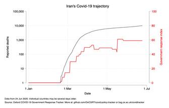 Come si vede dal grafico, nel mese di maggio la curva delle morti a causa del Covid ha ricominciato a salire, mentre le misure adottate dal Governo locale si sono attestate con un lieve calo nelle restrizioni