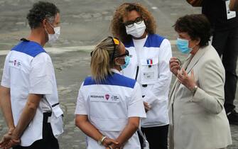 Tra gli ospiti ci sono 1.400 rappresentanti del personale sanitario e i familiari di alcune delle vittime del Coronavirus. Nella foto il ministro della Cultura francese, Roselyne Bachelot