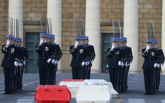 Nella tribuna anche rappresentanti di alcune categorie particolarmente messe alla prova dall'epidemia, dai pompieri, ai gendarmi, dagli agenti funerari agli insegnanti