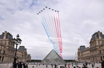 Le frecce tricolori francesi hanno attraversato tutta la città, colorando anche il cielo sopra il museo del Louvre