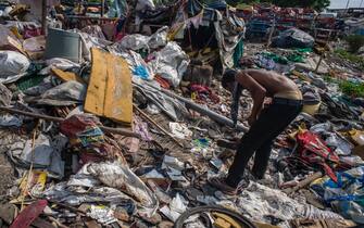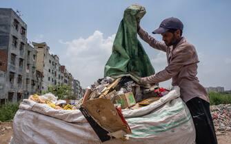 Un addetto delle discariche mentre lavora all'interno di un sito di smantellamento dei rifiuti a Nuova Dehli.