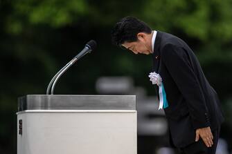 Le commemorazioni si sono tenute all'interno del parco del memoriale della Pace, al centro della città. Nella foto Shinzo Abe mentre depone una corona di fiori in memoria delle vittime