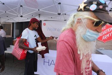 Alcuni senzatetto sono diventati disoccupati a causa della pandemia. I pasti offerti dall'Esercito sono da asporto per evitare gli assembramenti