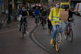 Ad Amsterdam, invece, i manifestanti per il clima si sono presentati sì con la mascherina ma anche in bicicletta