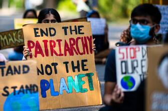 Nemmeno l'India, piegata dalla diffusione del Coronavirus, si è tirata indietro e ha visto diversi manifestanti presentarsi a New Delhi. Nella foto, una ragazza mostra un cartello con scritto "Facciamo finire il patriarcato, non il pianeta"